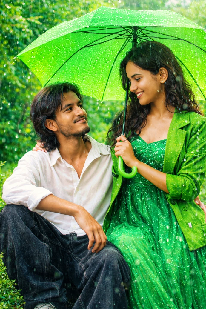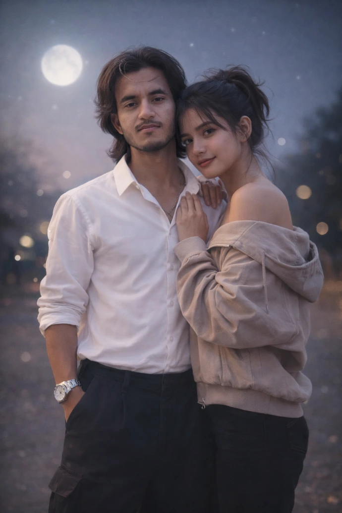 Ultra-realistic cinematic young couples and She has her hair tied in a messy ponytail, wearing a casual off-shoulder jacket. The background is softly blumed with a faint moon visible in the sky, creating a dreamy, magical atmosphere. The overall tone is intimate, peaceful, and slightly front on camera in slightly. A Man wears elegant-black-vibrant white shirt and black loose cargo pant and (100% Sane Face match in reference. Text& Branding.