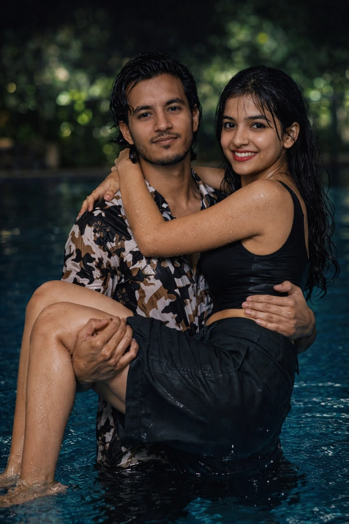 a highly realistic photo of a young Indian couple in a swimming pool at night. The