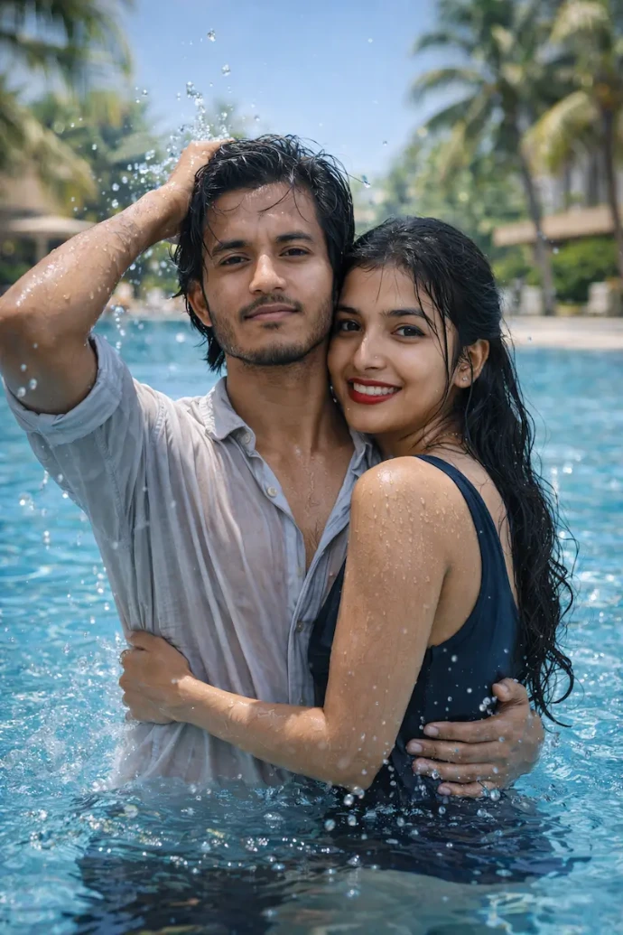 Ultra-realistic 8K cinematic photo of a romantic Indian couple standing in a luxury swimming pool during bright sunny daytime.